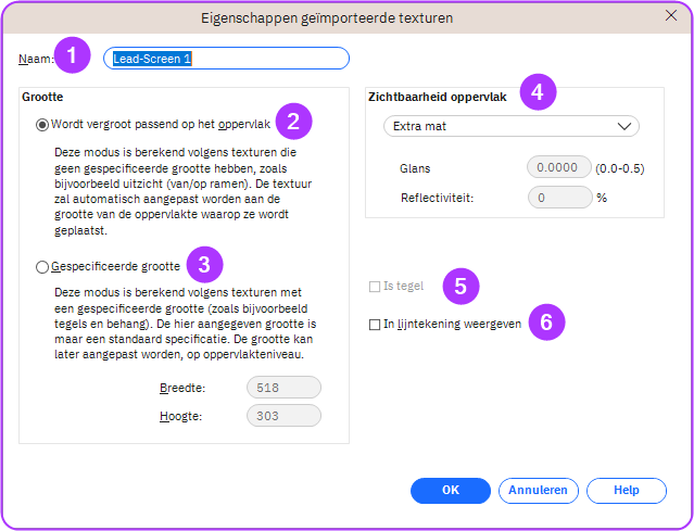 - Is tegel: Als er bij punt 2 een specifieke grootte is gedefinieerd, zorgt het aanvinken hiervan ervoor dat de voegfunctie in het dialoogvenster “Materiaal toewijzen” wordt ingeschakeld.