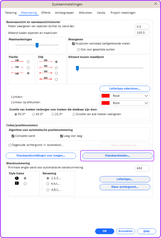 Met standaardmetingen kunt u de standaardmetingen die voor alle plannen zijn ingesteld, wijzigen. Dit is handig om te wijzigen als u voortdurend met een andere meting werkt dan de standaardset, en zal aanpassingen in de latere stadia van uw planning verminderen.