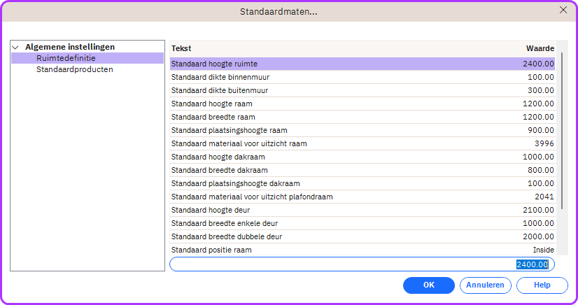 In het venster Standaardmetingen kunt u de afmetingen voor zowel uw plan in Ruimtedefinitiemodus en de Standaard producten.