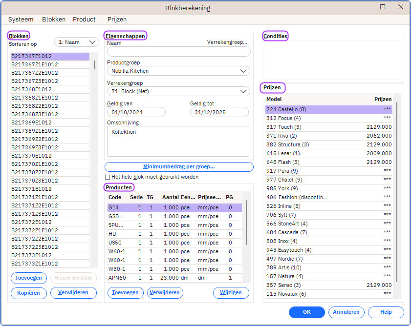 Bij gebruik van waarde blokken wordt de prijs in het groepsvak Prijzen weergegeven als 1.000, wat aangeeft dat het blok is ingeschakeld voor een specifiek model. Alle modellen die *** tonen, zijn niet geldig voor het huidige blok.