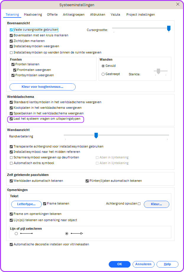 Wanneer u in de werkbladmodus een code toewijst, verschijnt er een venster met de vraag of de uitsneden ter plaatse moeten worden uitgevoerd. Winner zal nu automatisch het voorgestelde uitsnijdingstype toepassen voor alle projecten wanneer Systeem mag vragen naar uitsnijdingstypen niet is aangevinkt in de Systeeminstellingen. Hierdoor wordt de pop-up waarin u wordt gevraagd het uitsnijdingstype te bevestigen en bespaart tijd tijdens het ontwerp.