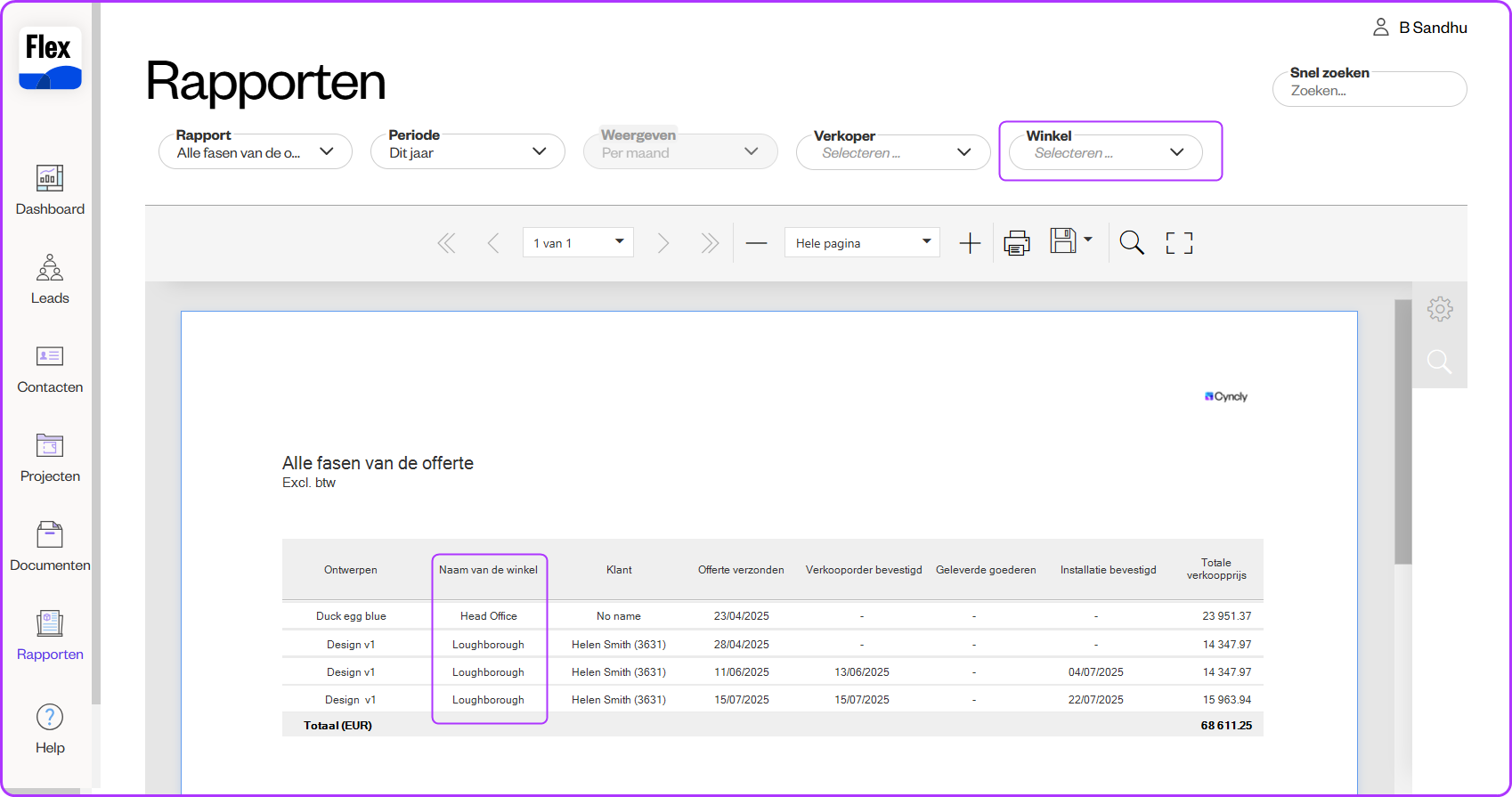 Het rapport voor alle offertefasen is verbeterd en bevat nu een kolom voor de naam van de Winkel waarin het Project zich bevindt. Hiermee kunt u de Informatie in winkels sorteren, zodat u de juiste Informatie naar het relevante team kunt versturen .