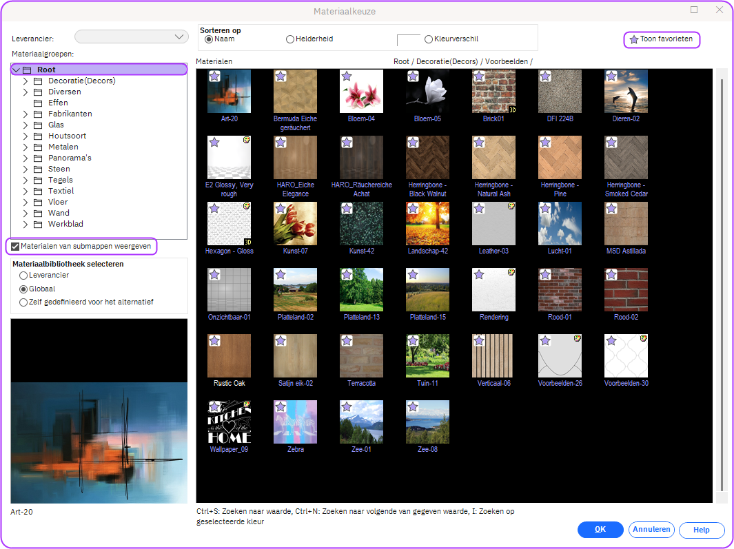 Eerder dit jaar hebben we de functionaliteit toegevoegd om een favorietentag toe te voegen aan uw meest gebruikte items in de materialenbibliotheek. We hebben deze ervaring verder verbeterd door al uw geselecteerde items te tonen wanneer u de map op het hoogste niveau selecteert en vervolgens het filter Favorieten weergeven toepast.