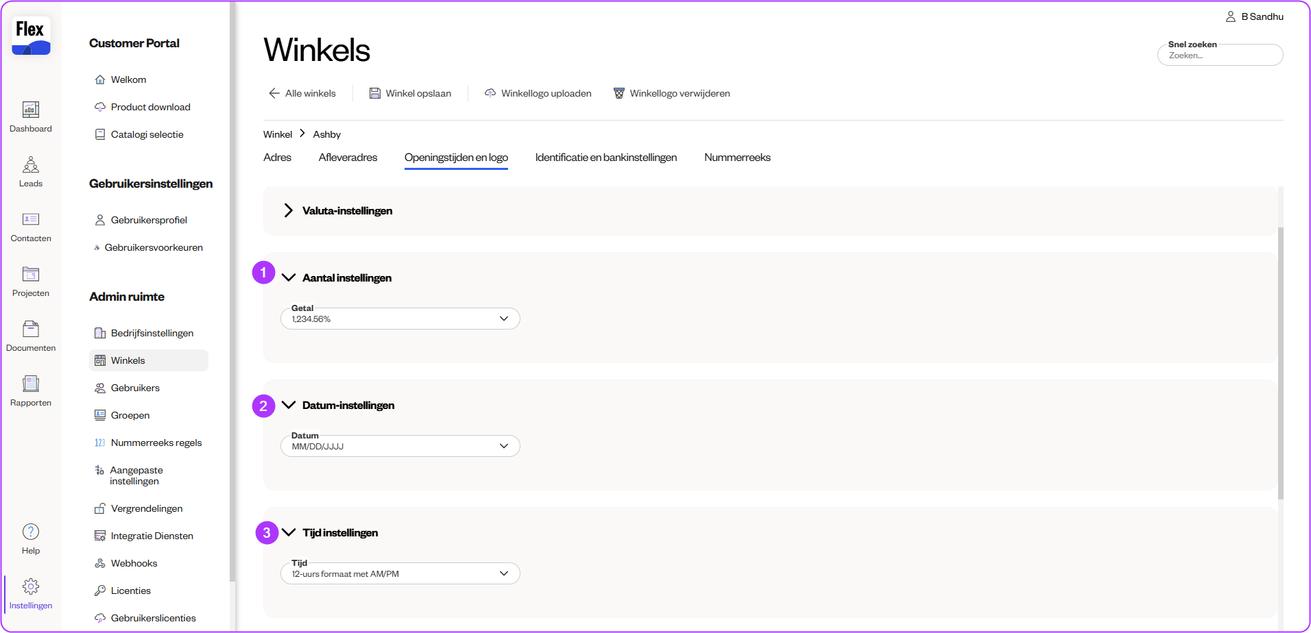 Stel het decimaalteken in voor numerieke gegevens die worden weergegeven op Flex. Formatteer daarnaast hoe datums en tijden worden weergegeven. Dit kan worden ingesteld op Bedrijfs- en Winkelniveau.