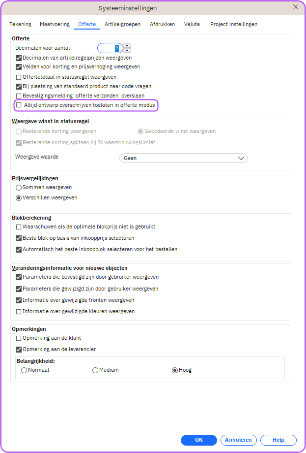 Tot nu toe konden gebruikers met beperkte rechten om schrijfbeveiligde ontwerpen te overschrijven ook geen ontwerpen overschrijven die de fase Offerte verzonden hadden bereikt. In veel gevallen is dit gedrag het gewenste en beoogde effect. Om meer flexibiliteit te bieden bij het beheren van ontwerpen tijdens de offertefase, is een nieuwe systeeminstelling geïntroduceerd: Altijd toestaan dat ontwerpen in de offertefase worden overschreven. Wanneer deze is ingeschakeld, kunnen beperkte gebruikers ontwerpen in de fase Offerte verzonden blijven bewerken zonder dat ze een nieuwe ontwerpversie hoeven aan te maken. De schrijfbeveiliging voor latere fasen, zoals na het afsluiten van een verkoopcontract, blijft ongewijzigd.