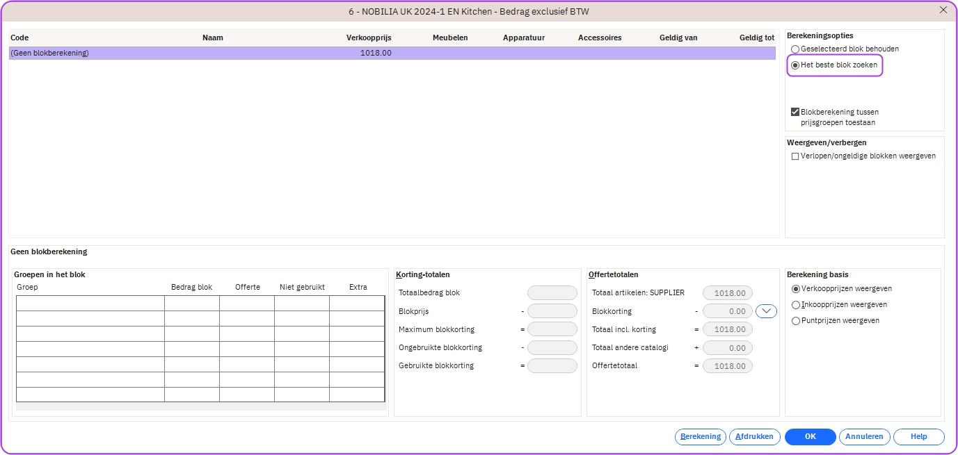 In de Systeeminstellingen voor Offerte kun je een optie selecteren om Winner de beste blokberekening automatisch te laten voorstellen. Voorheen werd deze optie alleen de eerste keer dat je naar het venster Blokberekening ging, vooraf geselecteerd en werd daarna teruggezet naar Geselecteerd blok behouden. De bedrijfsregel is in deze release bijgewerkt zodat de optie Beste blok zoeken nu vooraf geselecteerd blijft totdat je handmatig de blokkortingsinstellingen hebt gewijzigd of een ander blok hebt geselecteerd, of wanneer het ontwerp de status Offerte verzonden heeft. Voor meer informatie over Blokberekeningen klik hier.