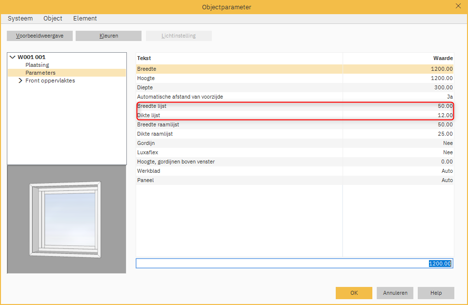 - In Objectparameters u kunt de dikte van het lijstwerk wijzigen.