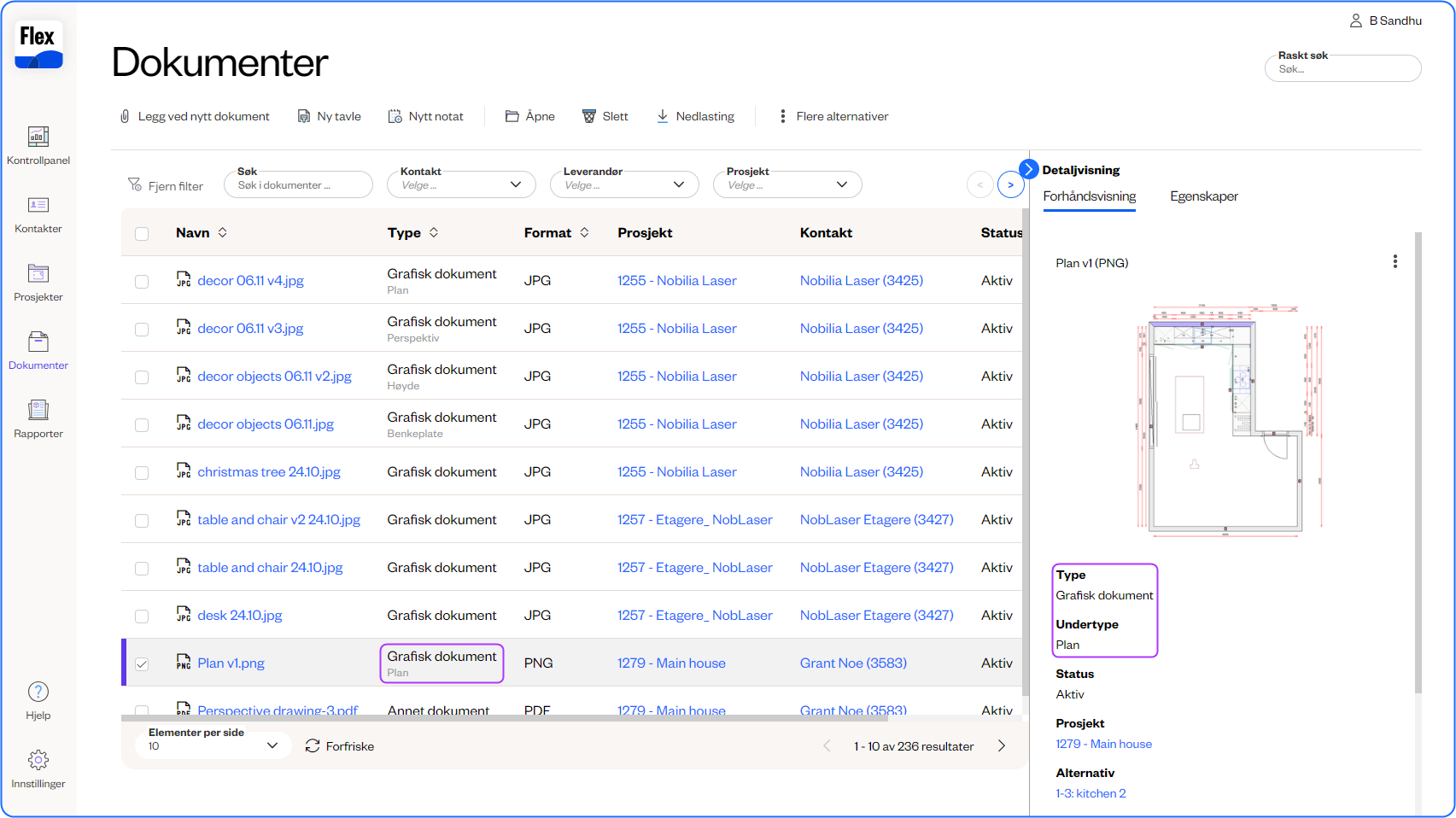 Ny undertype for grafiske dokumenter - Når du lagrer et grafisk dokument til Flex-plattformen, vil det nå ha en underkategori av plan, perspektiv, høyde og benkeplate. Undertypen kan også filtreres på ved visning av dokumenter på plattformen.