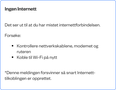 - Tydelig varsling om avbrudd i internetttjenesten - Når internett er nede vil du motta et tydelig varsel slik at du er klar over at det må iverksettes tiltak: