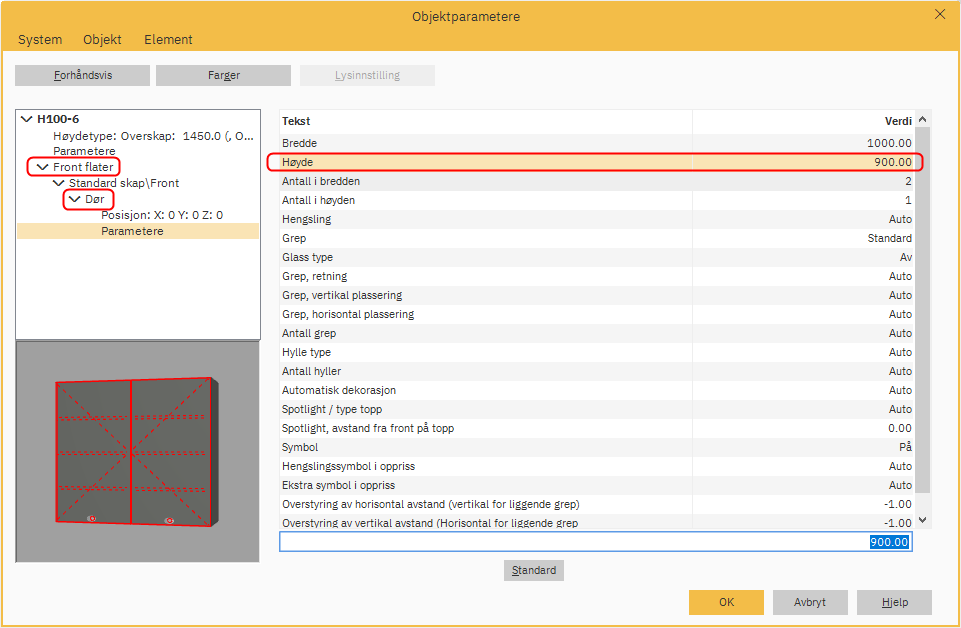 I Objektparametere vindu, velg Frontflater og så Dør.