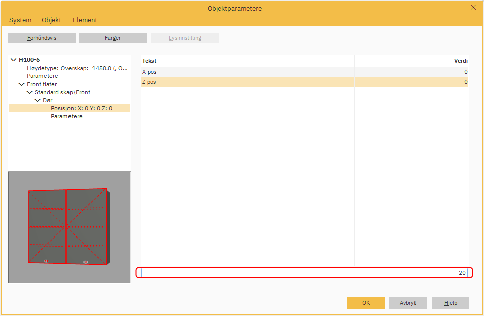 I tekstboksen nederst, skriv inn -20 for å senke døren for å ha front forlengelsen nedover.