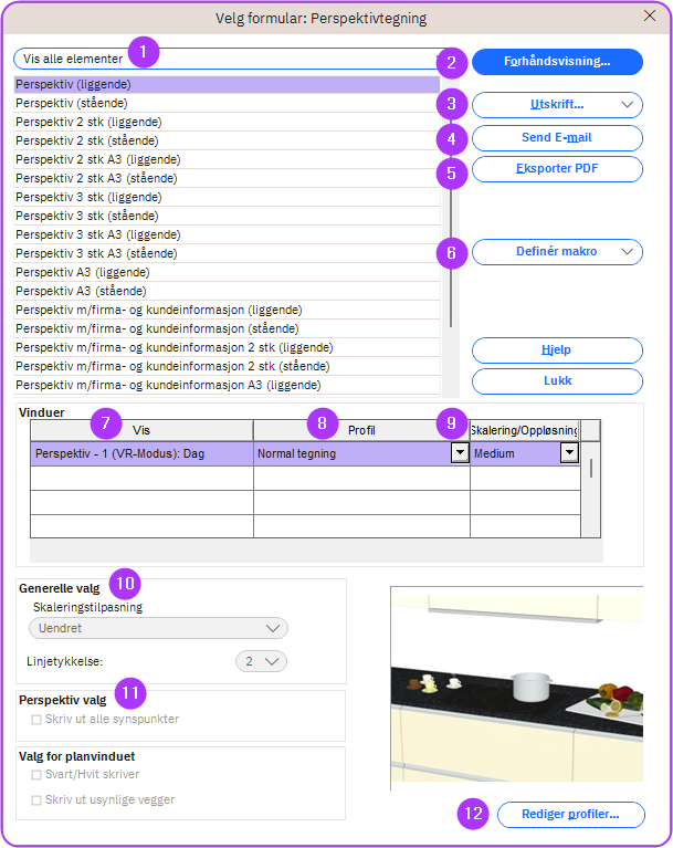 I Winner, når brukeren har valgt å skrive ut en Perspektiv-tegning vil Velg formular: Perspektivtegning vinduet vise utvalget av tilgjengelige alternativer og skjemaer.