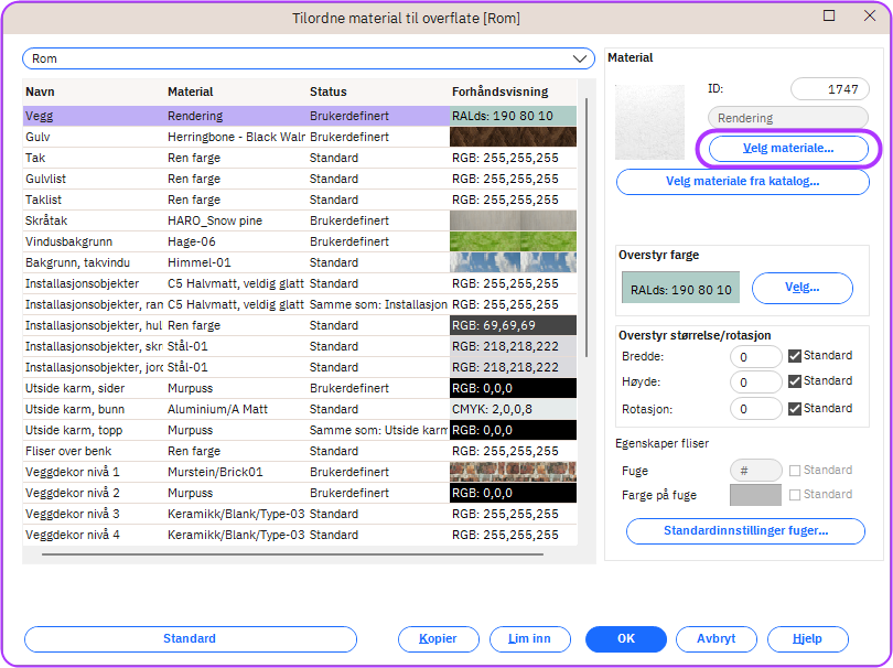- Er flis: Hvis en spesifisert størrelse ble definert i pkt. 2, vil det å merke denne aktivere fugemuligheten i dialogvinduet “Tildel materiale”.