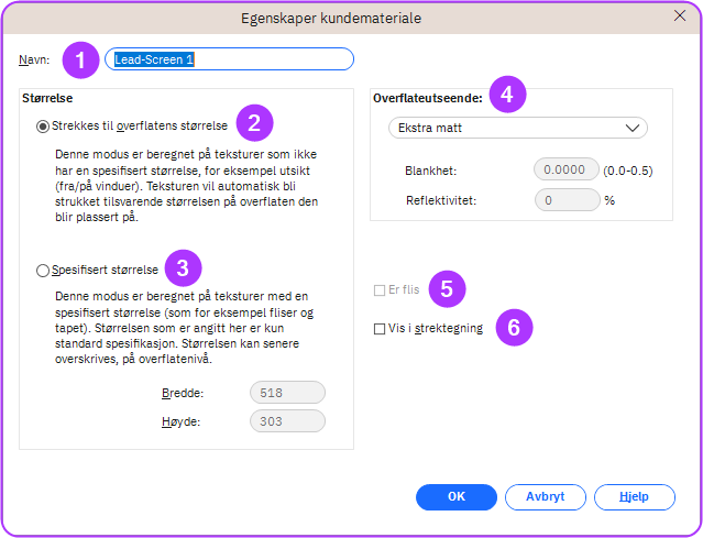 - Flateutseende: I rullegardinmenyen finnes 6 standardmaler fra “Ekstra matt” til “Glans 100%”. Det 7.nde alternativet “brukerdefinert” kan brukes til å definere glans og refleksjonsverdier manuelt.