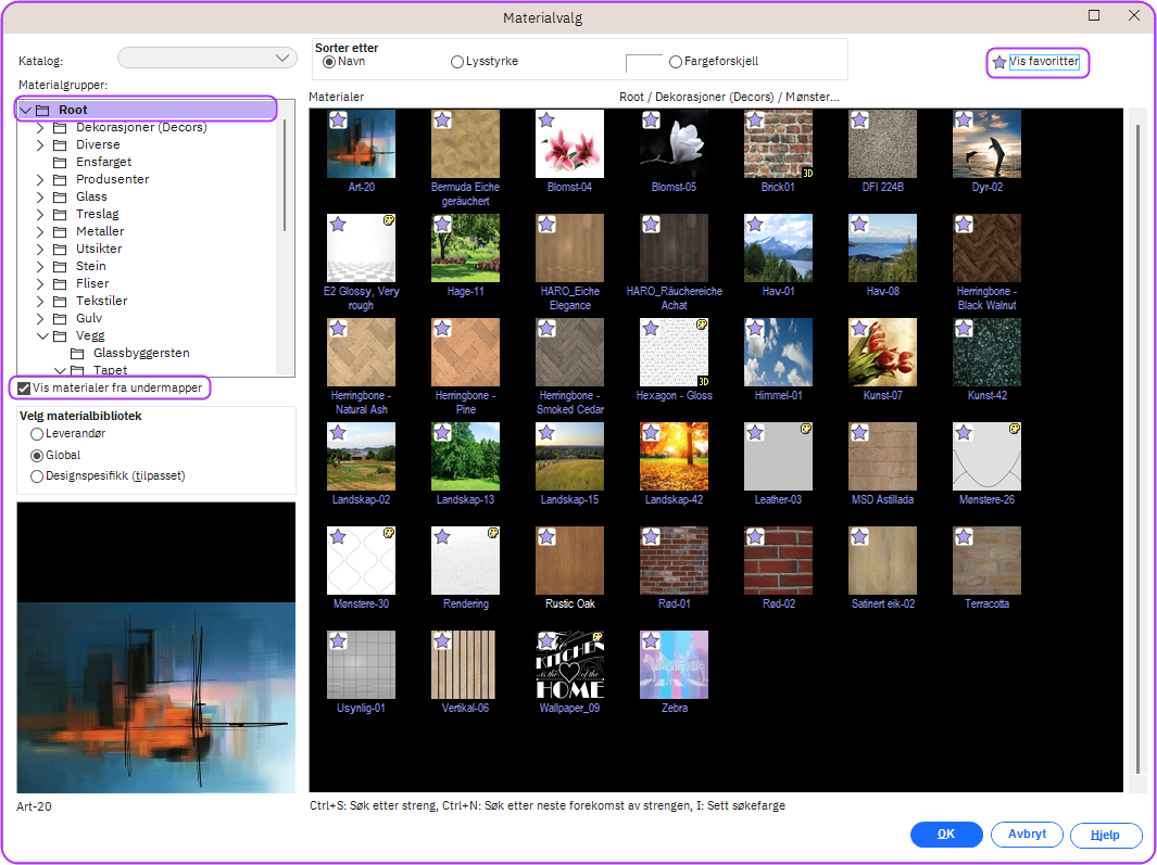 Tidligere i år la vi til funksjonen for å legge til en favoritt-tagg på de mest brukte elementene i materialbiblioteket. Vi har ytterligere forbedret denne opplevelsen ved å vise alle de valgte elementene dine når du velger toppmappen og deretter aktiverer Vis favoritter-filteret.