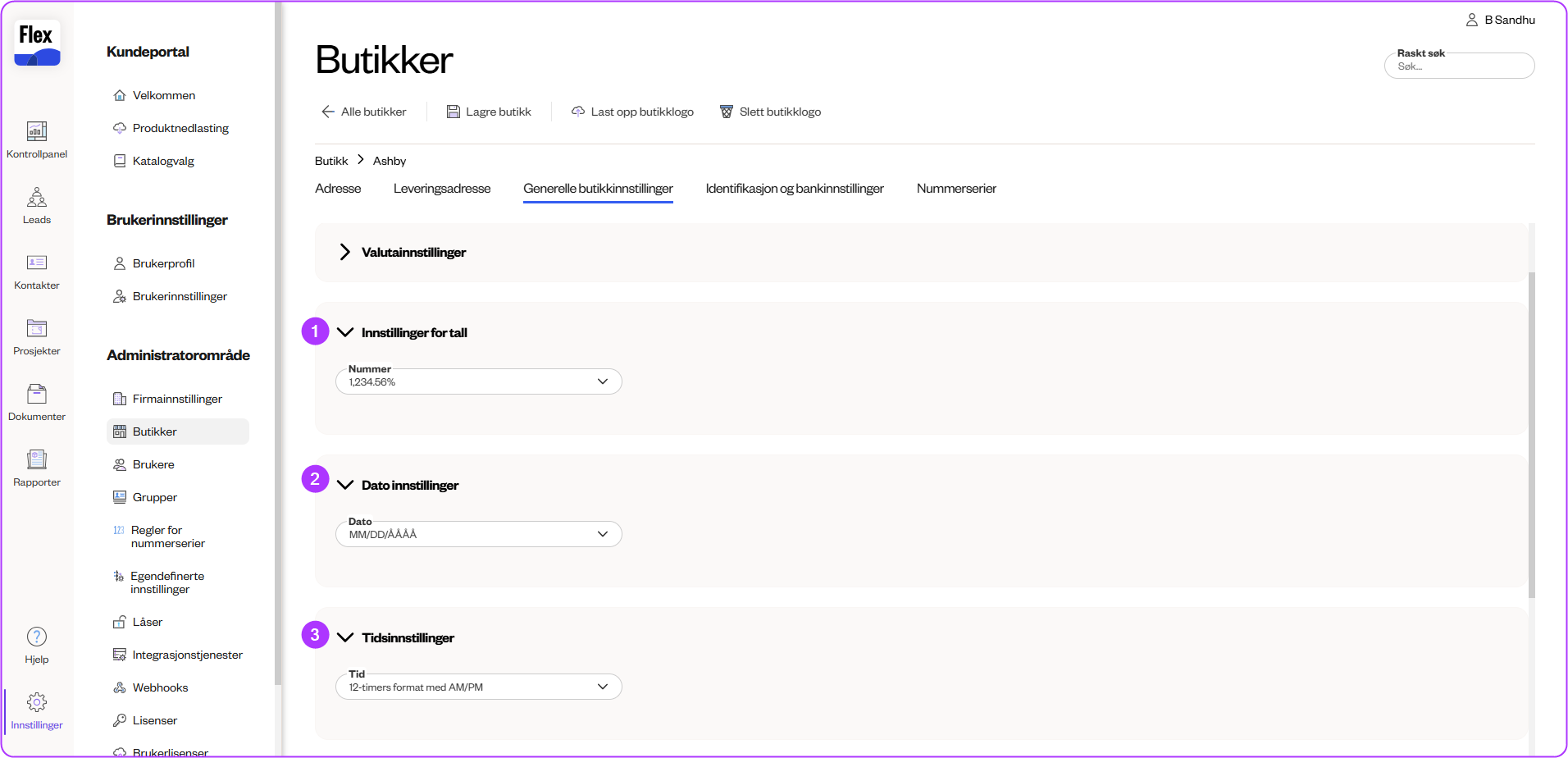 Sett desimalskilletegn for numeriske data som vises på Flex. Formater i tillegg hvordan datoer og klokkeslett vises. Dette kan settes på Company - og Shop-nivå.