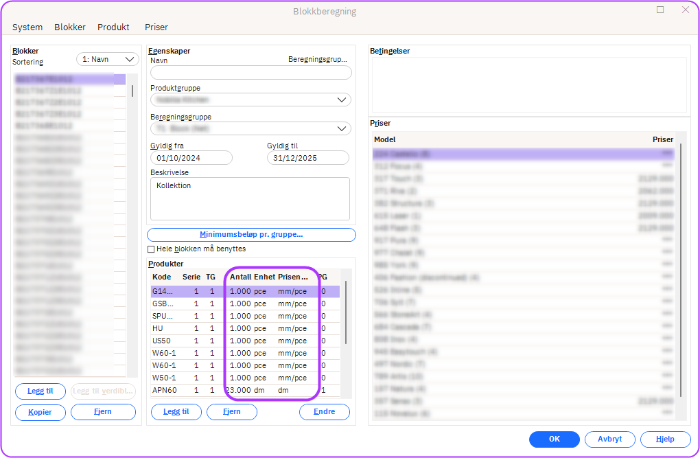 Noen kataloger inneholder artikler som beregnes med pris per desimeter i katalogen, men som skal vises som meter i tilbudet. Disse forskjellene ble ikke tydelig fremhevet i blokkberegningsdialogen tidligere. For Ä redusere forvirring er en ekstra Pris-enhet-kolonne lagt til i blokkdialogen for klarhet. NÄr et produkt endres, oppdateres Enhet, Pris-enhet og relatert produktgruppeinformasjon nÄ konsekvent, noe som sikrer at de viste enhetene bedre reflekterer hvordan produkter vises og prises. For mer informasjon klikk her.