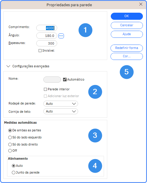 Este artigo fornece uma descrição detalhada da janela Propriedades da Parede a partir da versão 12.4a3. Depois de desenhar uma parede externa, é possível fazer ajustes em suas propriedades. Isso pode ser feito enquanto você está desenhando a sala ou depois de ter completado a sala.