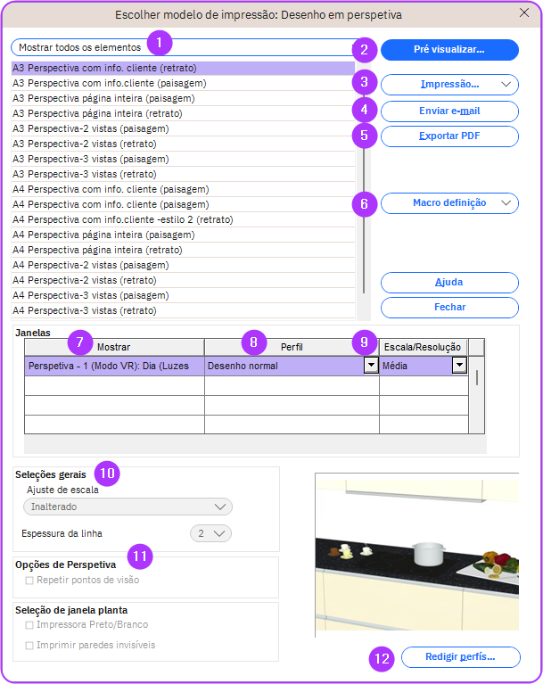 No Winner, quando o utilizador optar por imprimir um desenho em Perspetiva, a janela Escolher modelo de impressão: Desenho em perspetiva mostra a gama de opções e formulários disponíveis.