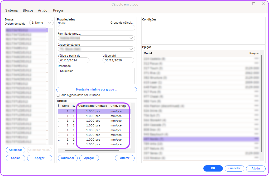 Alguns catálogos contêm artigos que são calculados com preço por decímetro no catálogo, mas devem ser apresentados como metros na cotação. Essas diferenças não eram claramente destacadas na caixa de diálogo de cálculo do bloco antes. Para reduzir confusões, uma coluna adicional Unidade de preço foi adicionada à caixa de diálogo do bloco para maior clareza. Ao alterar um produto, a Unidade, Unidade de preço e informações relacionadas ao grupo de produtos agora são atualizadas de forma consistente, garantindo que as unidades exibidas reflitam melhor como os produtos são mostrados e precificados. Para mais informações clique aqui.
