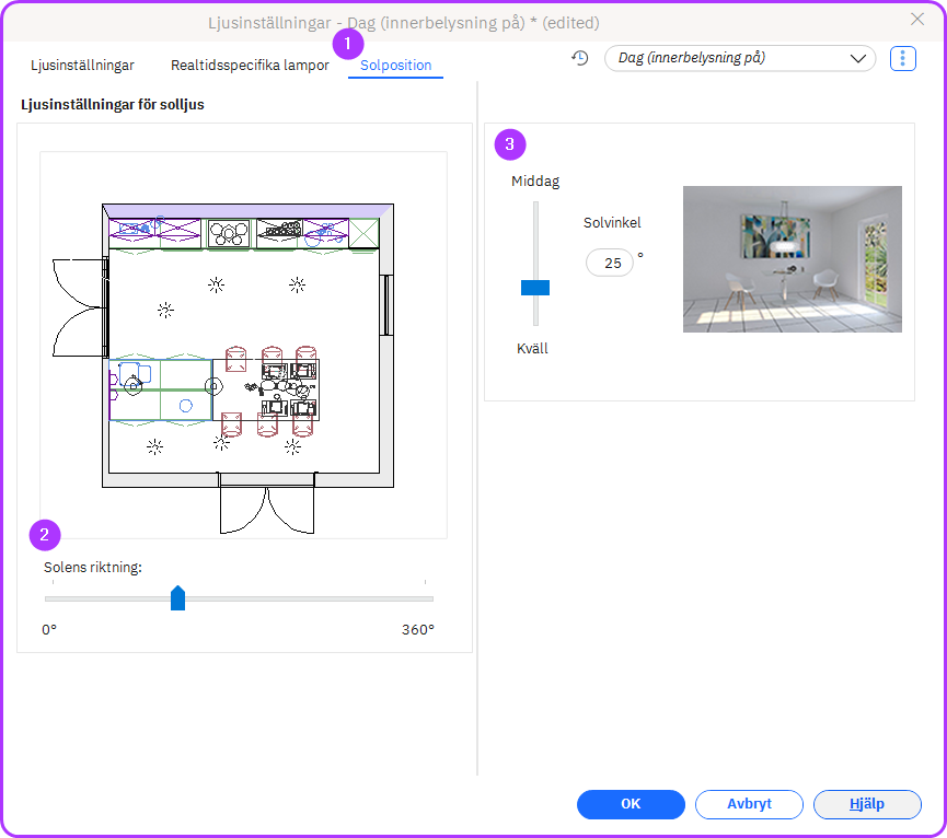 NOTERA!: Om du har valt att inte ha direkt solljus i designen på fliken Ljusinställningar då kommer du inte att kunna justera solens riktning eller vinkel.