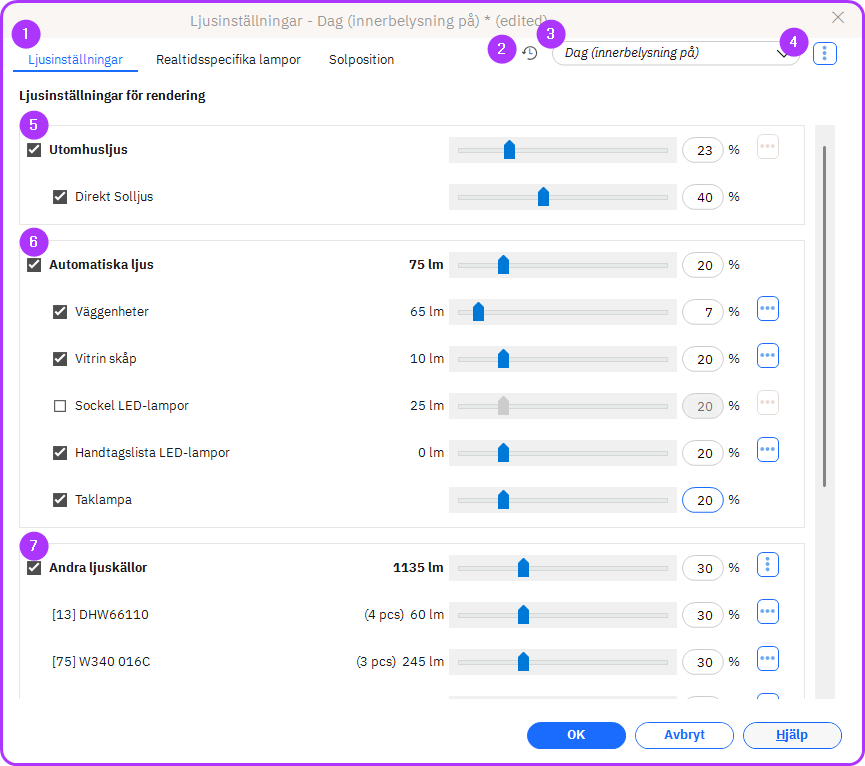 Ljusinställningar fliken visar alla lampor i designen. Du kan se ljusgrupperna under Automatiska ljus och belysning under Andra ljuskällor. Justera ljusintensiteten (lumen) med hjälp av reglagen, eller ange en specifik siffra i procentrutan. Ytterligare detaljerade justeringar kan göras genom att klicka på mer information ikonen