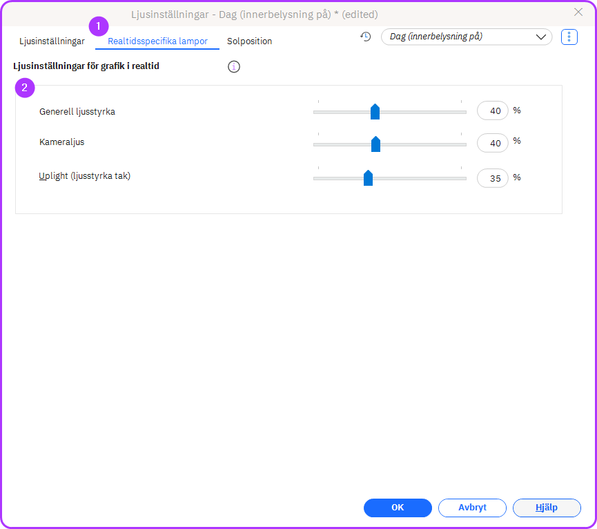 Realtidsspecifika lampor fliken kommer att justera belysningen i perspektivvyn men den gäller inte för renderingar.