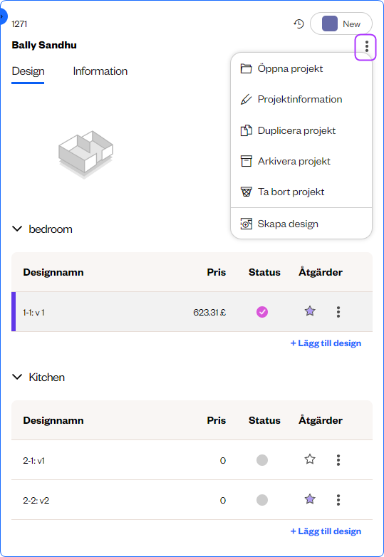 - Alla designs inom projektet kommer att listas här för att identifiera en som en favorit, klicka på stjärnikonen bredvid den