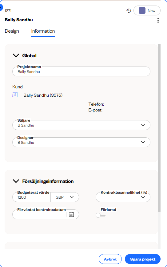 Projektnamnet, kundsäljaren och designern kan redigeras i sidofältet enligt följande: