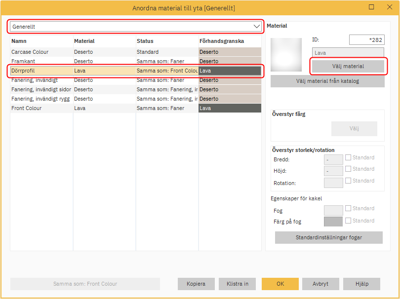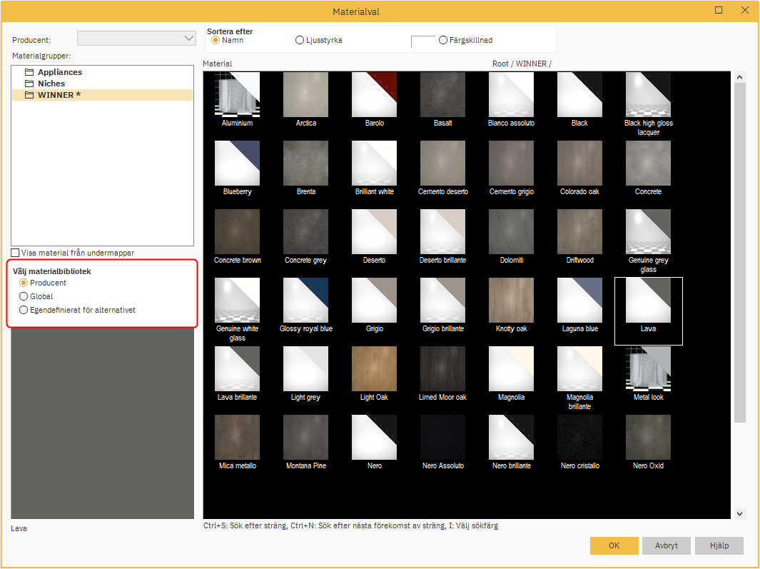 I fönstret Materialval finns ett bibliotek med material att välja. Material som tillhandahålls av leverantörens katalog, Winner Designs globala resurs och de material och bilder som du importerar i Anpassat för alternativet.