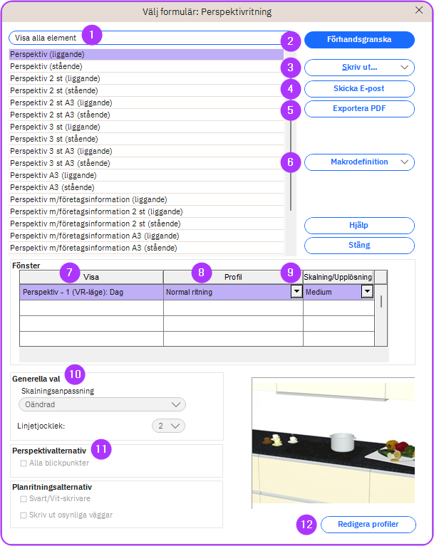 I Winner, när användaren har valt att skriva ut en perspektivritning visar Välj formulär: Perspektivritning fönstret de tillgängliga alternativ och formulär.
