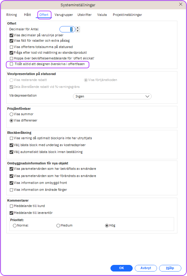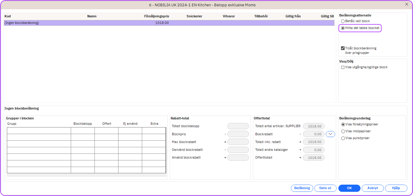 I Systeminställningarna för Offert kan du välja ett alternativ för att ställa in Winner att automatiskt föreslå den bästa blockberäkningen. Tidigare förvalde det här alternativet endast första gången du gick in i fönstret Blockberäkning, och återgick sedan till Behåll valt block. Affärsregeln har uppdaterats i den här versionen för att nu behålla alternativet Hitta det bästa blocket som det förvalda alternativet tills du manuellt har ändrat blockrabattinställningar eller valt ett annat block, eller när designen har statusen Offert skickad. För mer information om Blockberäkningar klicka här.